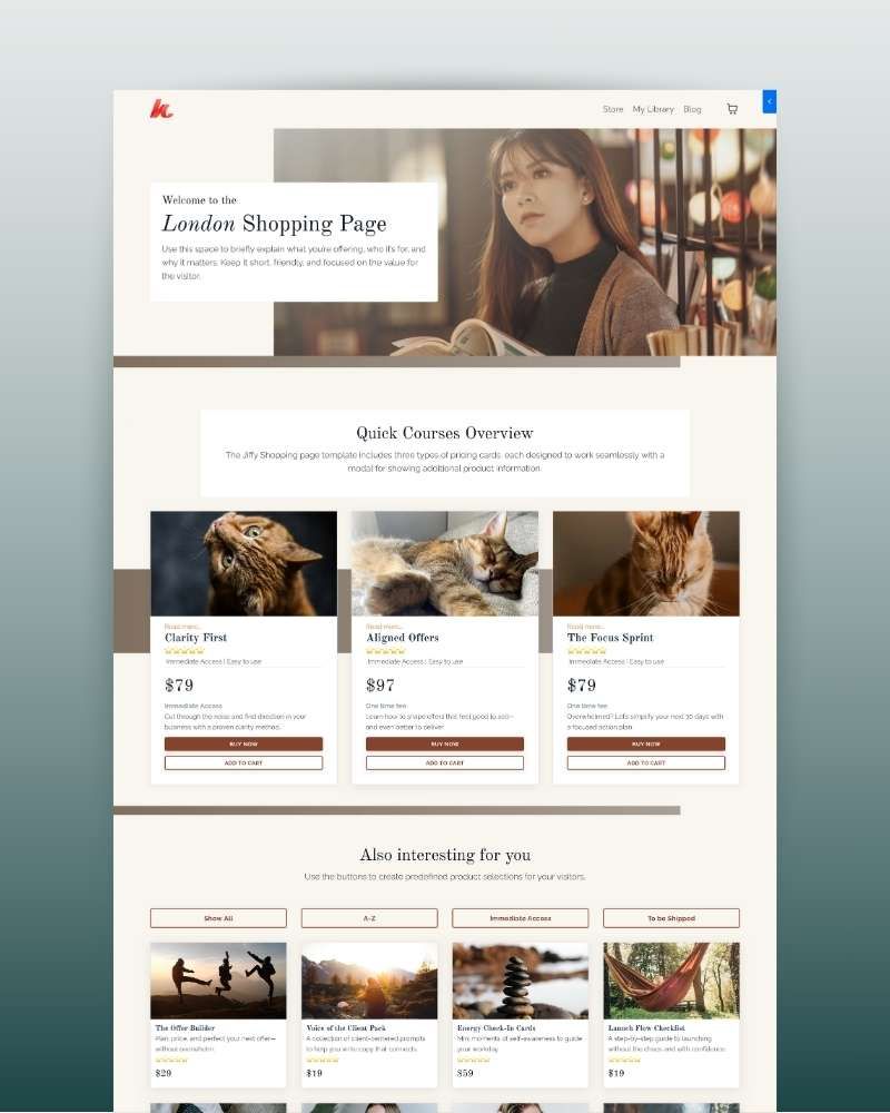 Whether you're selling a signature course, a collection of templates, or a digital product suite, this template gives your shop a modern, professional look while keeping things easy to navigate and beautifully on-brand.
